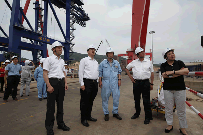 楊軍一行參觀了海西重機港口設備總裝現(xiàn)場,并重點參觀了在建的阿聯(lián)酋110米桁架自升式海工平臺,聽取了海西重機董事長鄧振山對公司目前生產經營形勢、生產負荷情況等方面的介紹,對海西重機在國際海工平臺市場上所取得的成績給予了肯定。