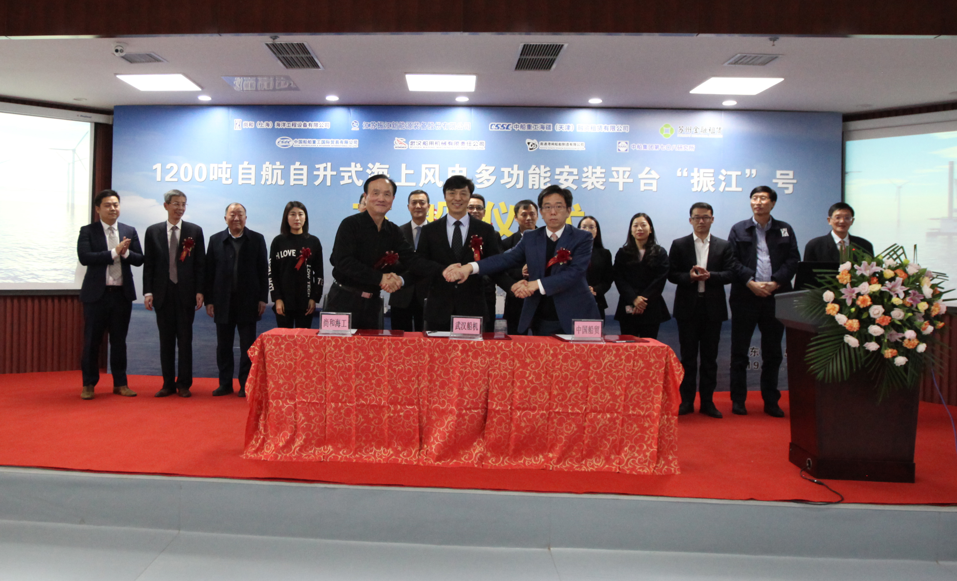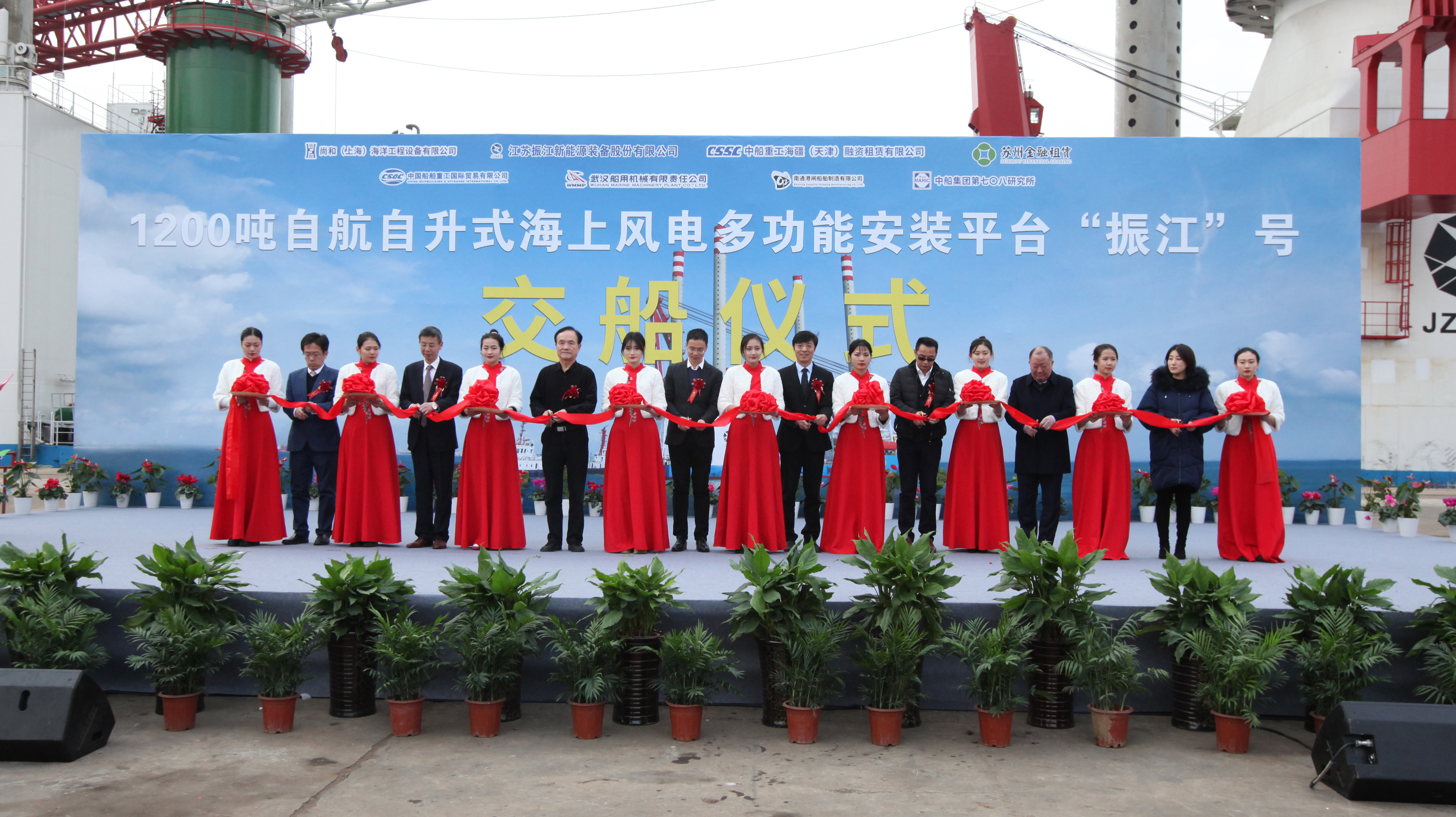 12月13日下午,國內(nèi)首座1200噸自航自升式風電安裝平臺——“振江”號交付儀式在武漢船機海西重機隆重舉行。尚和(上海)海洋工程裝備有限公司、江蘇振江新能源裝備股份有限公司、中信銀行、中國船舶及海洋工程設計研究院、中國船級社等單位領導和項目相關人員共同見證了這一歷史性時刻。