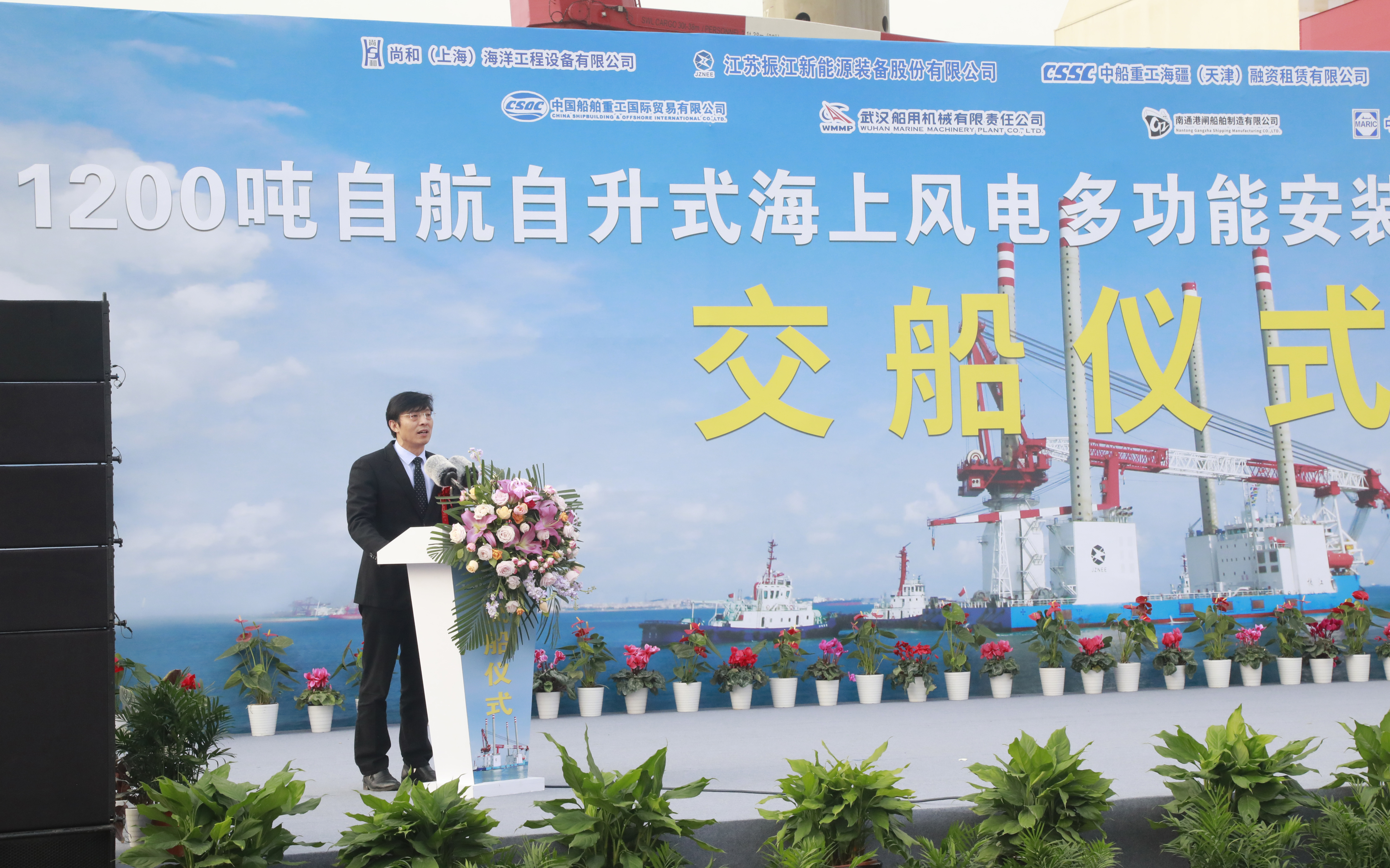 武漢船機黨委書記、董事長馬聚勇代表公司在平臺交付儀式上致辭,對參加交船儀式的各位領導、同仁以及為該平臺生產(chǎn)制造和試驗成功付出辛勤勞動的所有監(jiān)造人員和工作人員表示由衷感謝。馬聚勇同志指出,“振江”號風電安裝平臺是武漢船機連續(xù)交付多艘自升式輔助平臺后,再次作為總包方承擔的全部項目建造任務。項目合同簽訂后,公司上下高度重視,充分發(fā)揮設備集成和平臺總包能力,集中武漢本部和青島海西兩地優(yōu)勢資源,不斷加強生產(chǎn)組織管理,從源頭上保證了建造質(zhì)量和周期,較好地滿足了平臺建造進展。自平臺開工建造到今天正式交船,中國船級社始終給予悉心指導,各參建方發(fā)揮自身優(yōu)勢,通力合作,突破多項技術難關,為平臺順利交付和使用提供了強有力保障