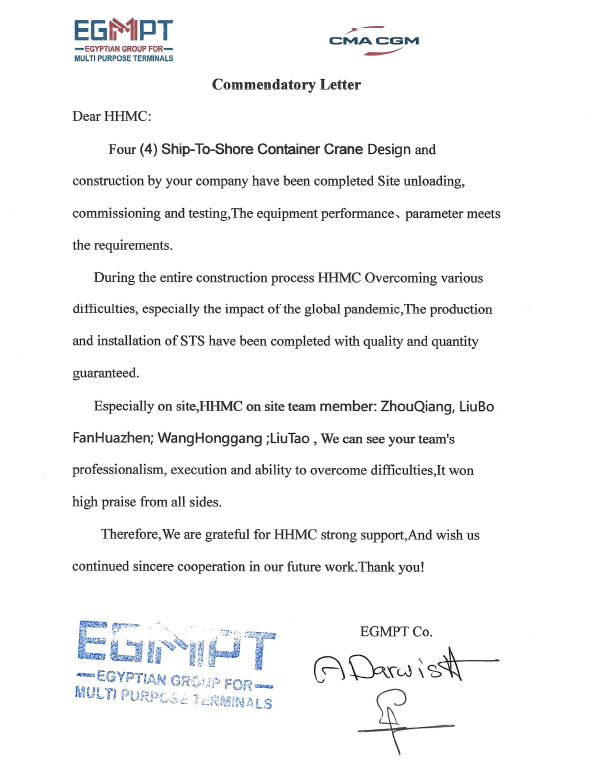 亞歷山大港多用途碼頭為埃及國家重點項目,埃及國家領(lǐng)導(dǎo)人員高度關(guān)注該項目進展。岸橋到達用戶碼頭后,項目組嚴(yán)格按照策劃節(jié)點穩(wěn)步推進每天工作,確保當(dāng)日事當(dāng)日畢,最終在整個項目組通力協(xié)作以及用戶的積極配合支持下,岸橋順利完成交付,并按計劃進入保產(chǎn)。期間,埃及總理、交通部部長對海西重機產(chǎn)品及現(xiàn)場項目團隊給予了充分肯定,多家當(dāng)?shù)孛襟w對此進行了專題報道。用戶特地向我司發(fā)來一封表揚信以示感謝。