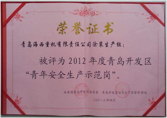 近日,青島海西重機(jī)涂裝生產(chǎn)組喜獲殊榮,獲評(píng)2012年度青島開(kāi)發(fā)區(qū)“青年安全生產(chǎn)示范崗”榮譽(yù)稱(chēng)號(hào)!