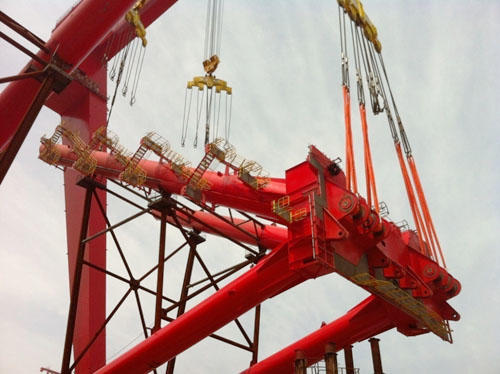 經(jīng)過一天的準(zhǔn)備,整個(gè)人字架翻身過程有條不紊:起鉤、落鉤、制動(dòng)、割余量,再起鉤、落鉤、翻身、加固、摘鉤,一氣呵成。在1600T龍門吊上下小車配合下,在我部統(tǒng)籌指揮下,各部門協(xié)同作戰(zhàn),歷時(shí)僅4小時(shí),500T人字架順利翻身,1600T龍門吊投產(chǎn)以來首戰(zhàn)告捷。