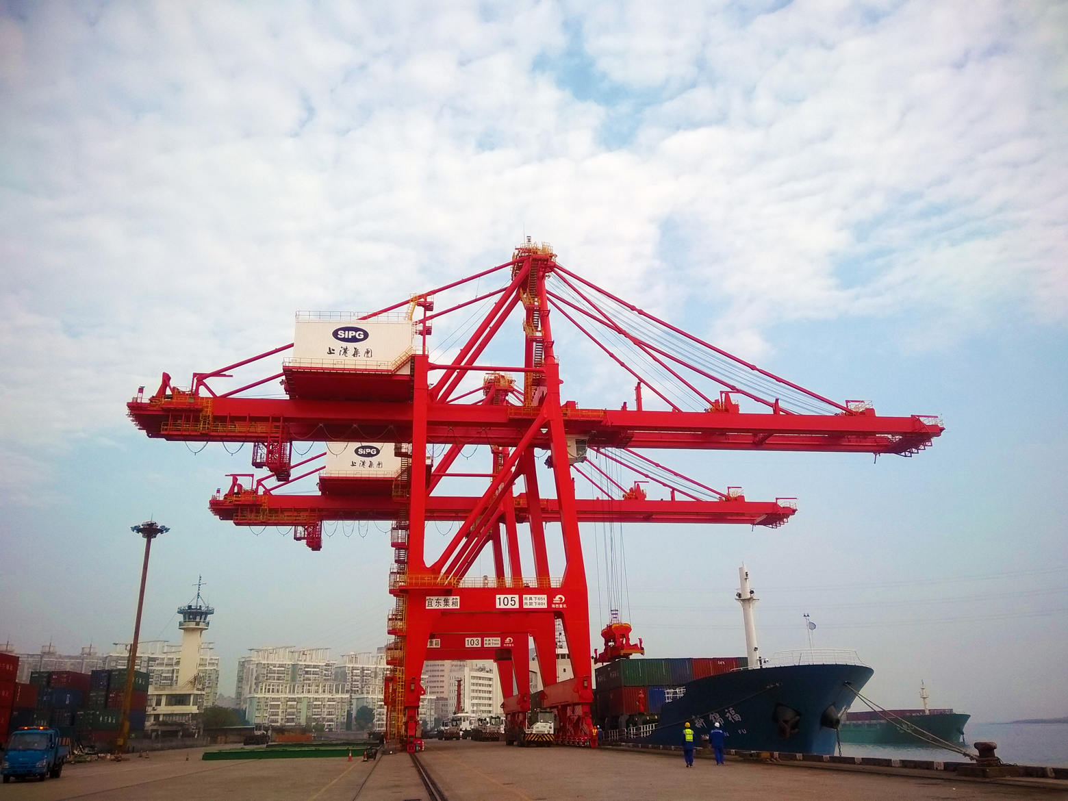 12月13日早5時,G215項目的2臺舊機岸橋如期發(fā)運,上海的天氣也終于放晴,雨后的太陽總是那么的耀眼。經過雨水的洗禮,屹立在黃浦江邊的2臺新機岸橋在藍天白云的映襯下也顯得格外耀眼,那一抹鮮紅已然成為黃浦江風景的一部分,那一抹鮮紅也成為了海西重機走進上海港的名片。
