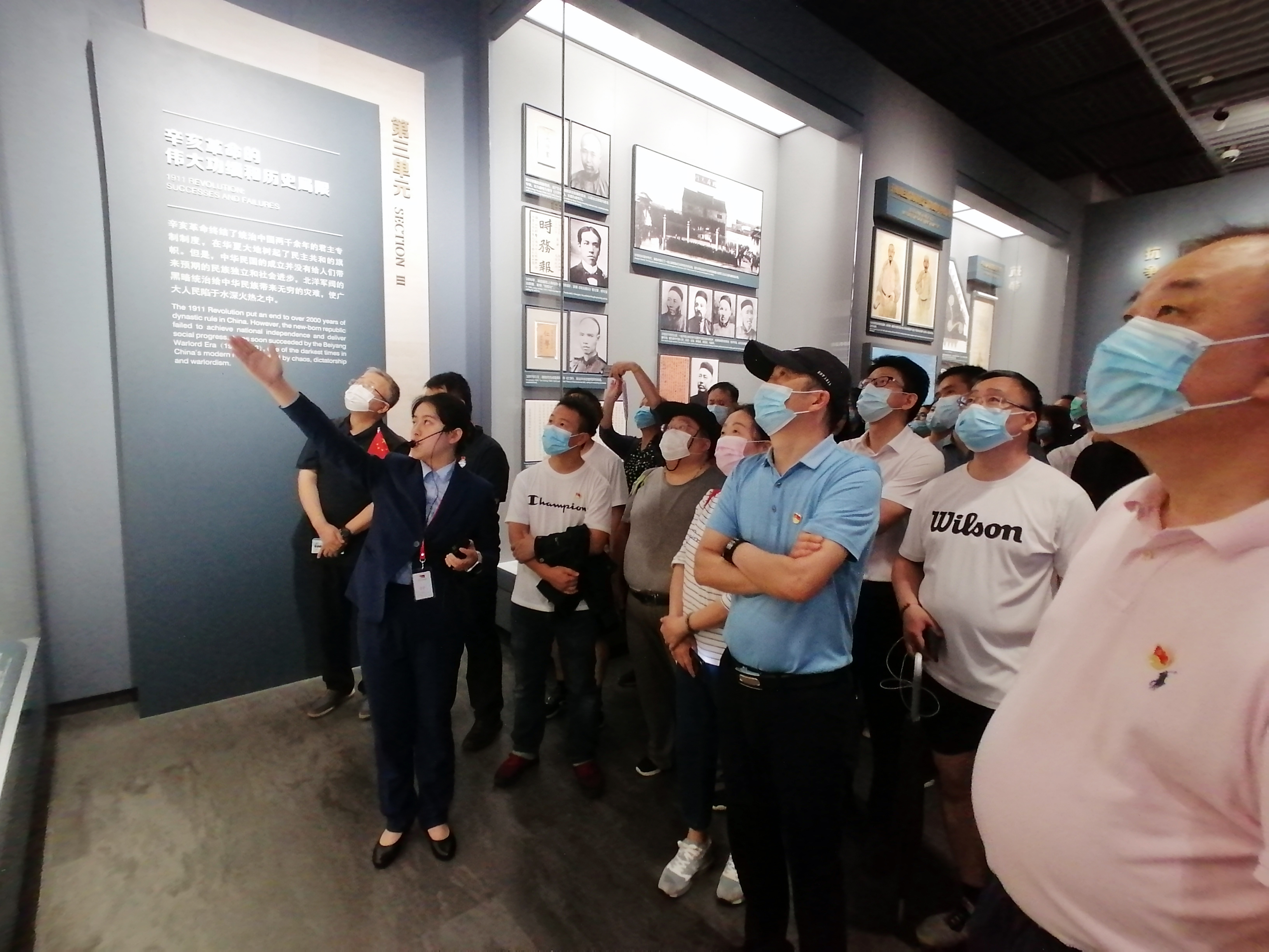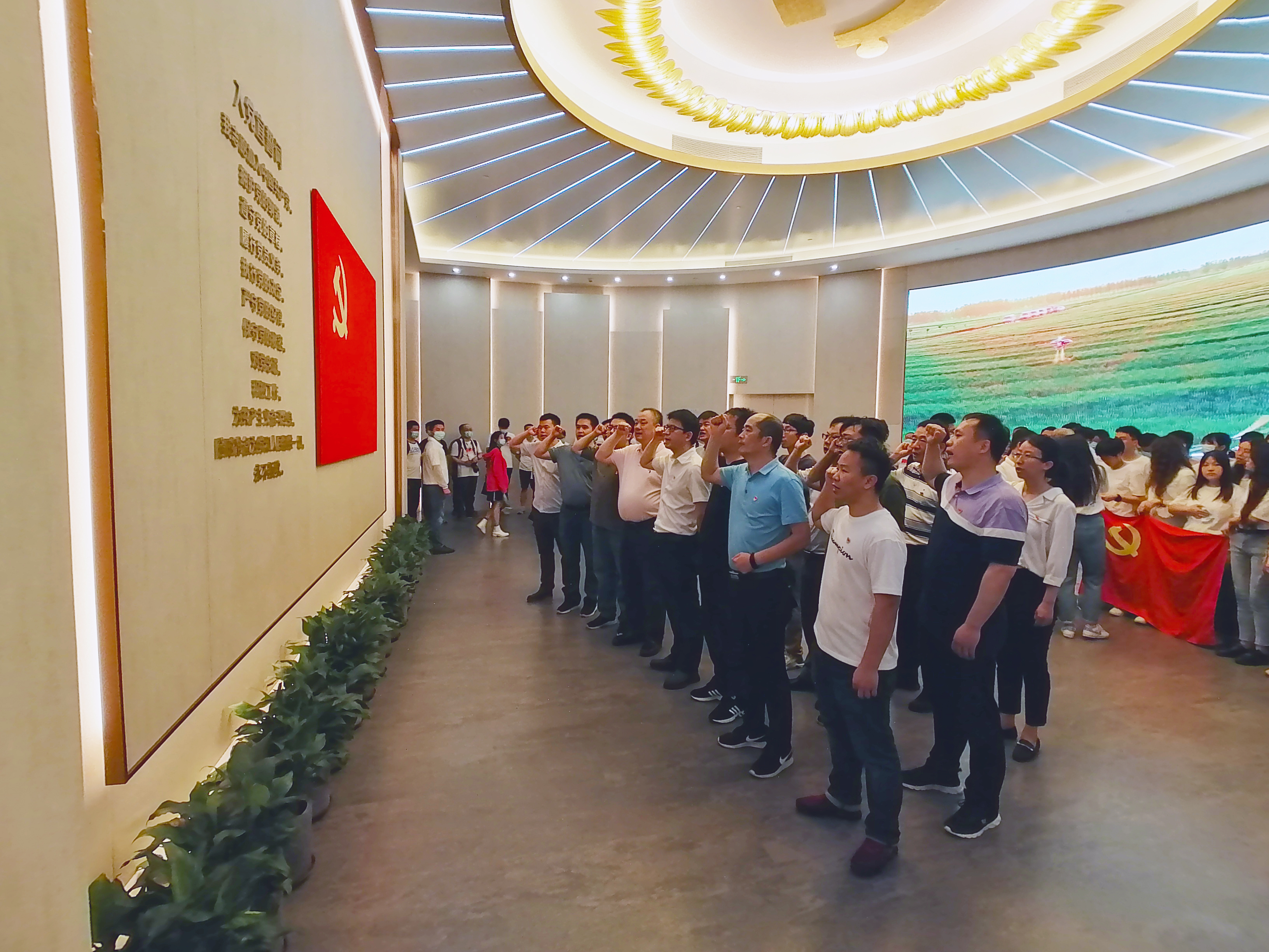 走進(jìn)紀(jì)念館,映入眼簾的是一個(gè)巨幅瓷板畫(huà)《日出東方——從石庫(kù)門(mén)到天安門(mén)》,畫(huà)面中容納了一大會(huì)址、紅船、井岡山、北京天安門(mén)等革命圣地元素,反映了中國(guó)共產(chǎn)黨由小到大、由弱到強(qiáng)的奮斗歷程。進(jìn)入序廳,迎接參觀者的是主題雕塑《偉大的開(kāi)端》,13位一大代表站在石庫(kù)門(mén)前,向我們展示著他們的堅(jiān)定信念和激昂的革命情懷。跟隨講解員,沿著展區(qū)布景的脈絡(luò)一路參觀了“前仆后繼、救亡圖存”,“民眾覺(jué)醒、主義抉擇”,“早期組織、星火初燃”,“開(kāi)天辟地、日出東方”,“砥礪前行、光輝歷程”五個(gè)部分,展廳集中呈現(xiàn)了建黨時(shí)期的珍貴文獻(xiàn)、照片、實(shí)物,并以數(shù)字化、智能化的方式,立體重現(xiàn)了中國(guó)共產(chǎn)黨建黨初期在上海的革命實(shí)踐。大家在銘刻歷史印記的文物實(shí)物,內(nèi)容詳實(shí)的刊物、圖片、圖表前駐足,在視頻影像和場(chǎng)景還原處停留,仔細(xì)聆聽(tīng)講解,用心感悟、感知中國(guó)共產(chǎn)黨在上海創(chuàng)建的光榮歷史、奮斗歷程。最后,在宣誓大廳,面對(duì)鮮紅的黨旗,朱聲凱帶領(lǐng)大家宣誓,一起重溫入黨誓詞。