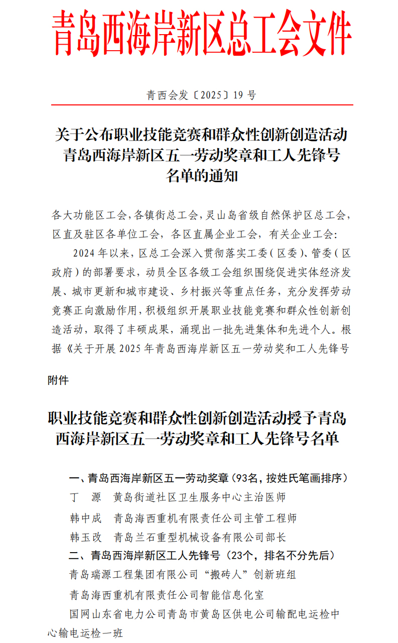 近日,海西重機智能信息化室榮獲西海岸新區(qū)“工人先鋒號”稱號,主管工程師韓中成榮獲西海岸新區(qū)“五一勞動獎?wù)隆?。這一雙項殊榮的取得,既是對公司堅持創(chuàng)新驅(qū)動發(fā)展的認可,更是對新時代產(chǎn)業(yè)工人矢志技術(shù)報國的褒獎。