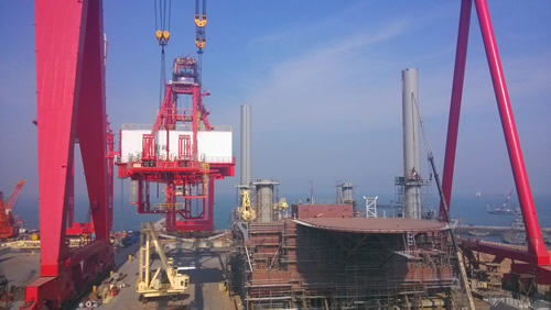 2014年3月2日,在海西重機(jī)橋吊部裝工場上方,1600t大型龍門起重機(jī)下方,一臺(tái)長度為140m、寬度為30m的岸橋大梁組件從一臺(tái)90m自升式海洋平臺(tái)聳立的樁腿旁邊穿過,順利與突堤碼頭上的門框合攏,證實(shí)了海西重機(jī)在港機(jī)和海工兩個(gè)領(lǐng)域同步發(fā)展的能力和實(shí)力。